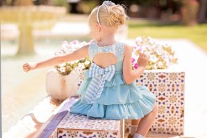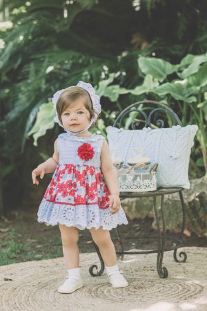 Vestido rayas celeste perforado combi flores rojas Dolce Petit.