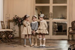 Vestido villela beige pliegue falda volantes Dolce Petit.