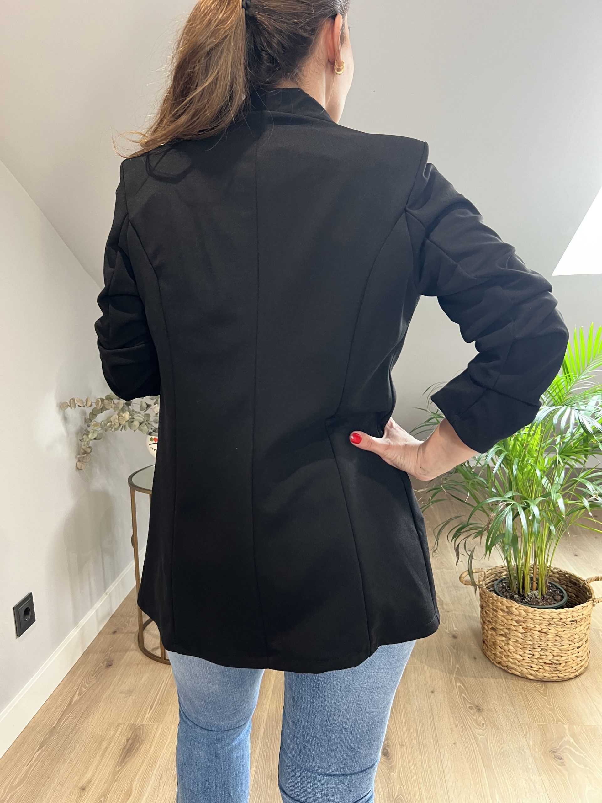 Blazer manga fruncida negra, es una Blazer básica con detalle de frunces en las mangas. Diseño abierto. Cuello tipo esmoquin. Hombros marcados con hombreras. Falsos bolsillos con tapeta. Talla única, adecuada aprox. hasta la talla L o 40. La modelo utiliza la talla S, y mide 167 cms.