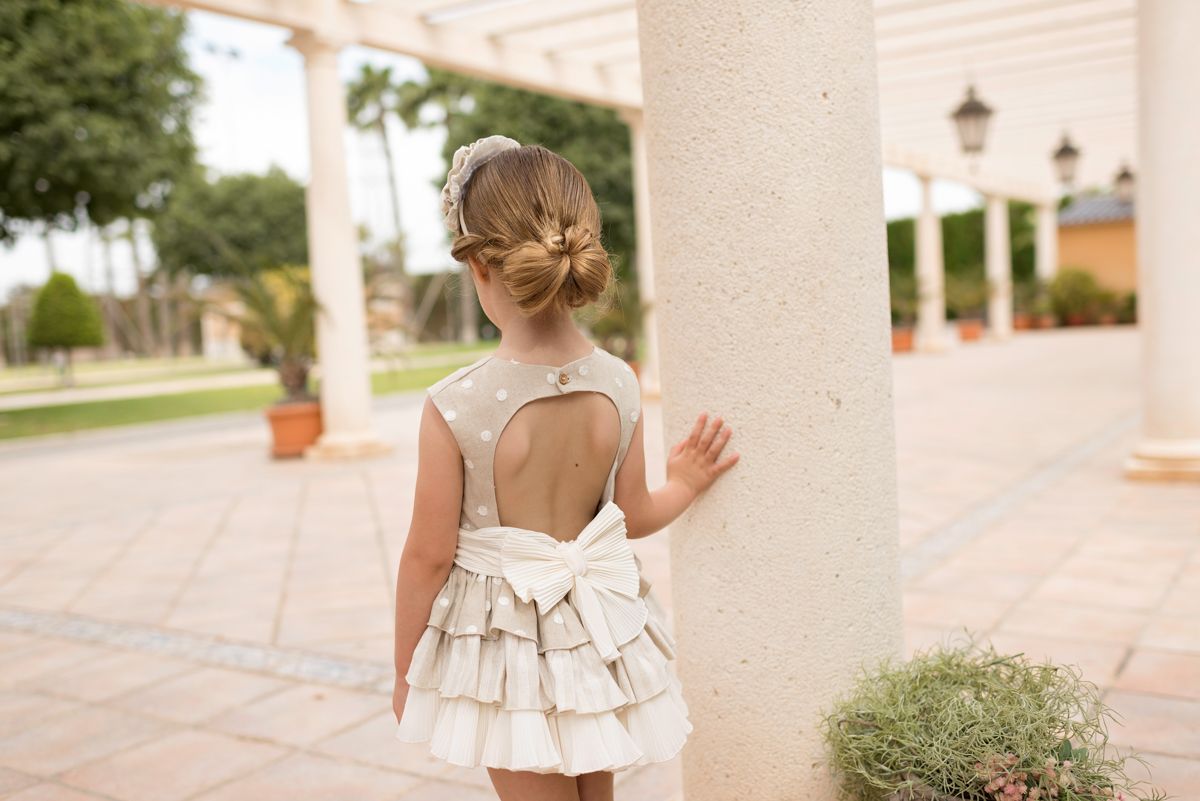 Vestido lino piedra bodocos falda volantes beige Dolce Petit.